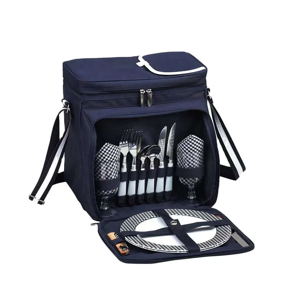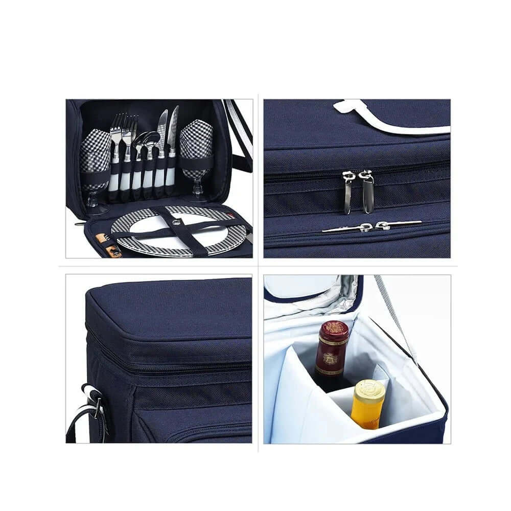 - Integriertes Picknick-Set: Der Rucksack enthält ein komplettes Picknick-Set für vier Personen, einschließlich Teller, Besteck, Gläser, Servietten und ein Schneidebrett. Alles ist sicher und ordentlich in speziellen Fächern verstaut.